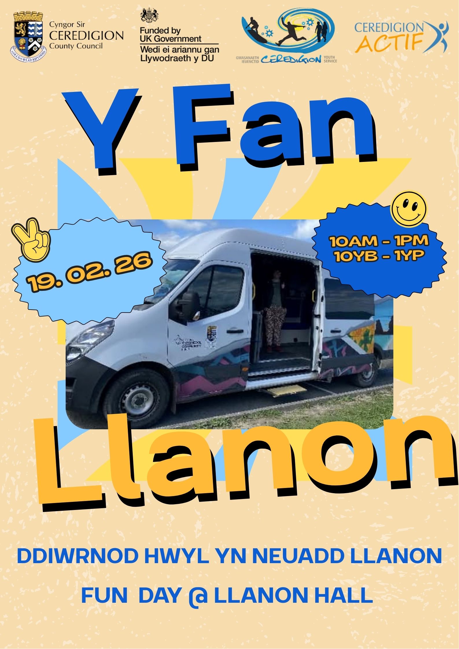 Bydd Y Fan yn Niwrnod Hwyl Llanon yn Neuadd Llanon. Dewch i ddweud helo wrth ein gweithwyr ieuenctid a chael diod boeth.
