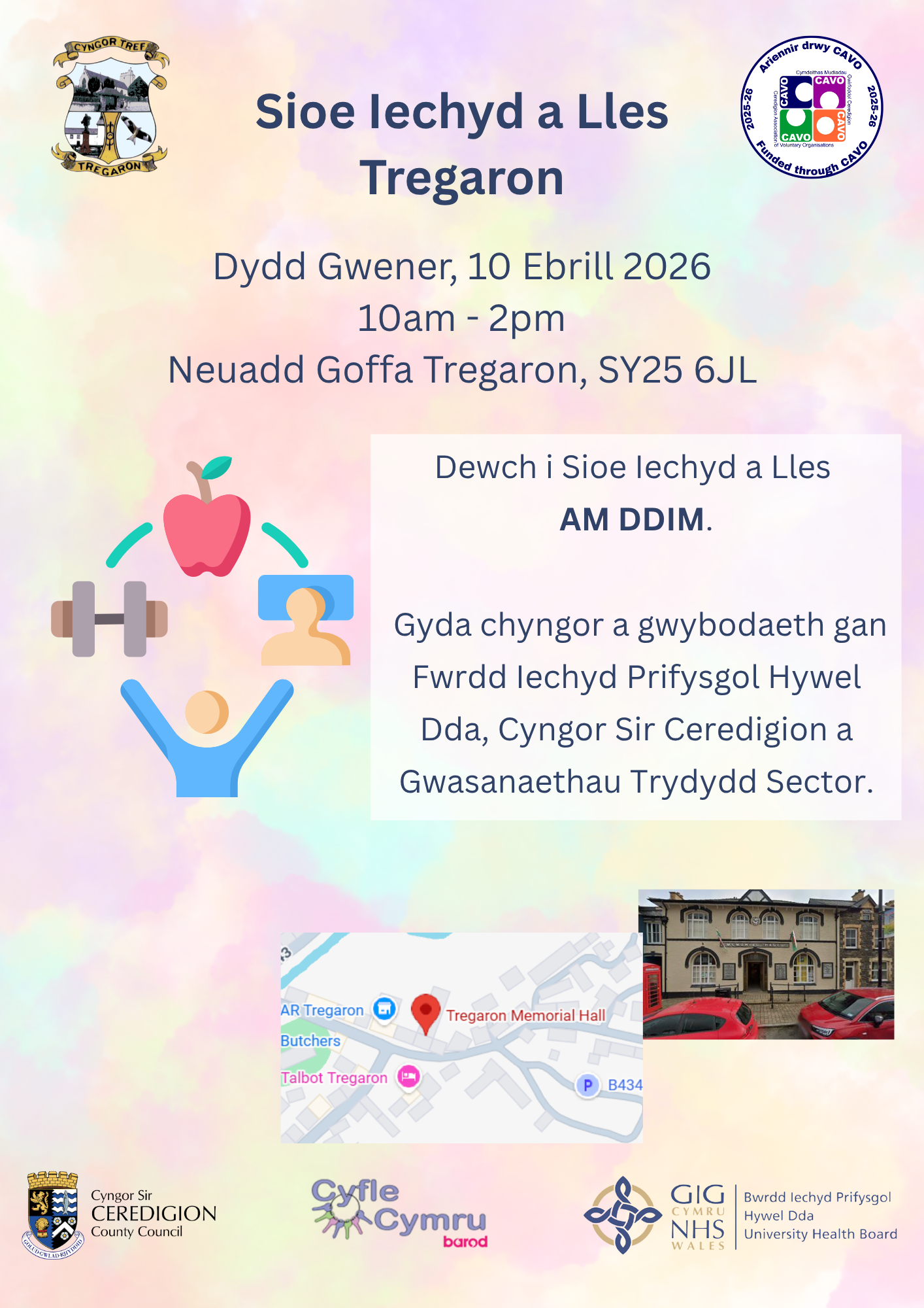 Dewch i Sioe lechyd a Lles AM DDIM. Gyda chyngor a gwybodaeth gan Fwrdd lechyd Prifysgol Hywel Dda, Cyngor Sir Ceredigion a Gwasanaethau Trydydd Sector.