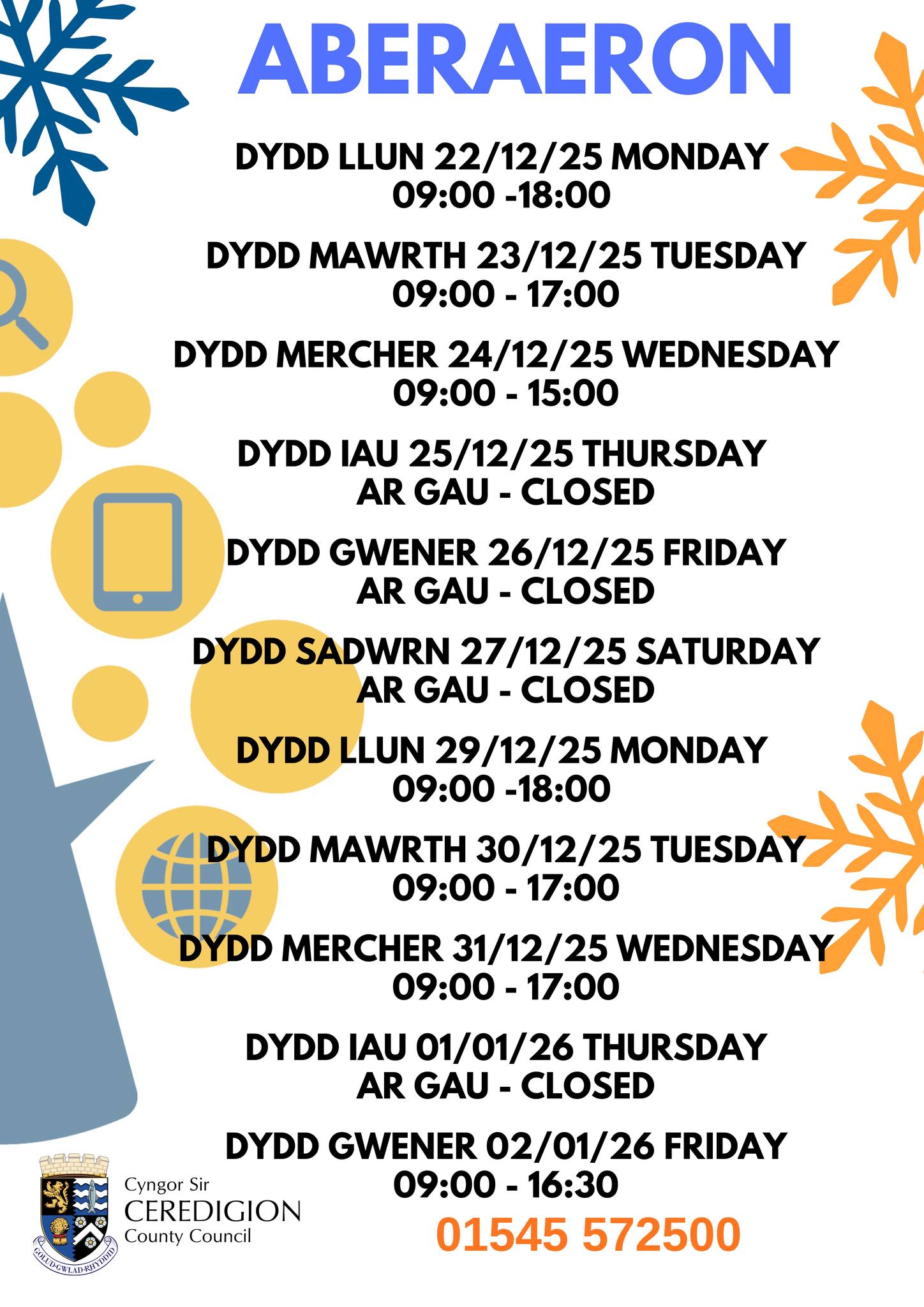 - Toiledau - Oherwydd pandemig Covid-19, nid yw’r cyfleuster hwn ar gael ar hyn o bryd.