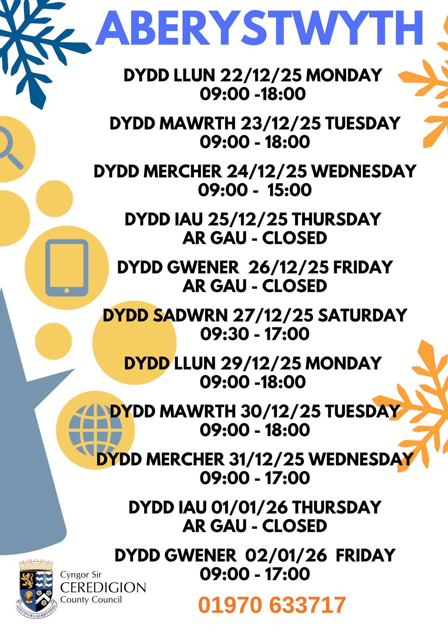 | Sadwrn | 09:30-17:00 |
