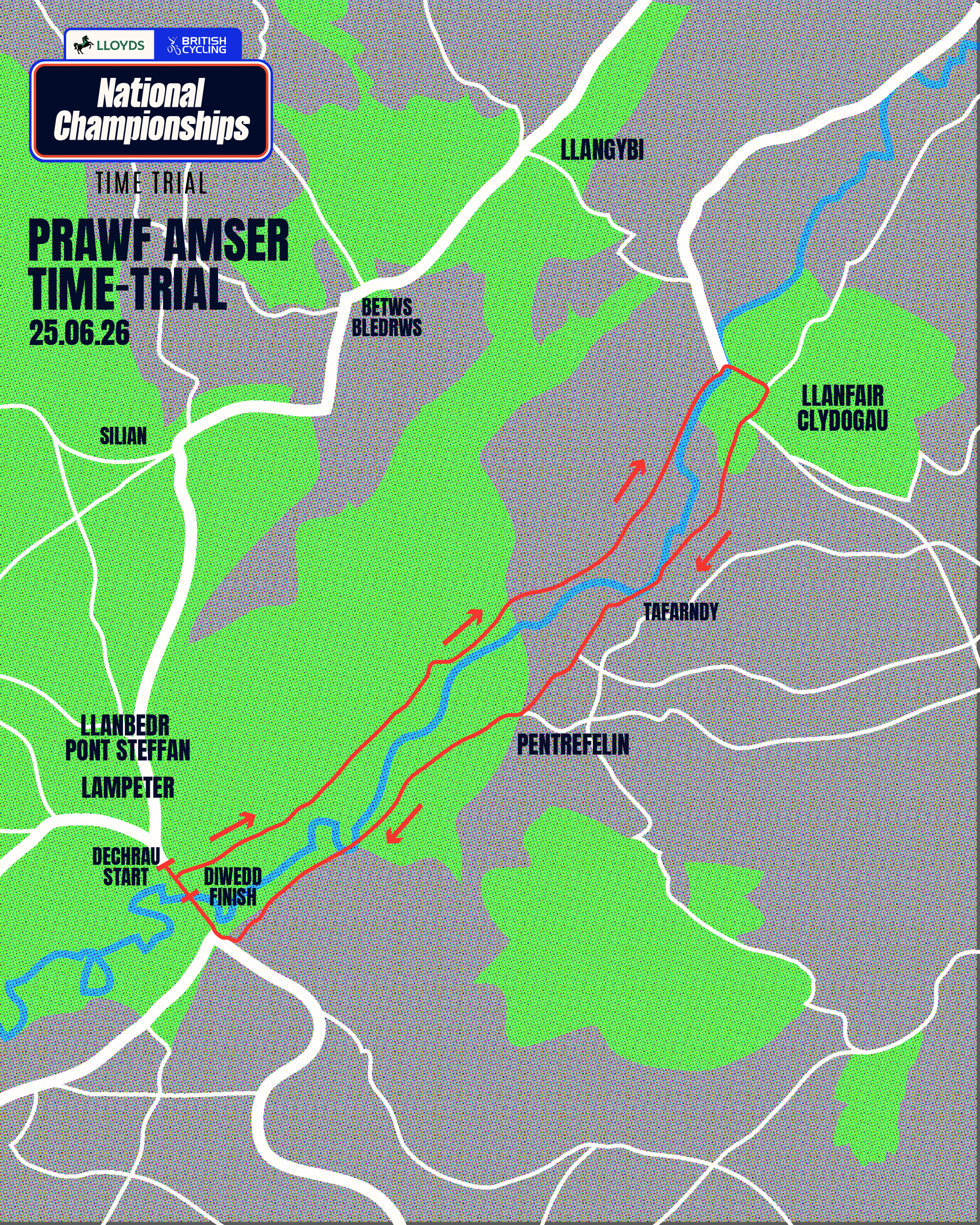 Ar gyfer cwrs newydd y Ras yn erbyn y Cloc eleni bydd y beicwyr yn anelu am dref farchnad hyfryd Llanbedr Pont Steffan. Bydd yn cychwyn nepell o gampws Prifysgol Cymru yn Llambed, a bydd cwrs newydd y gylchdaith yn ymlwybro heibio i gaeau glas a bryniau prydferth yr ardal.